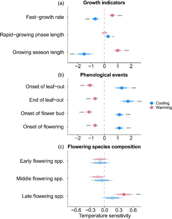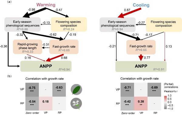 研究结果表明,在15年增温处理下,ANPP显著增加,而在降温处理下降低。值得注意的是,增温对ANPP的促进效应随时间推移逐渐增强,而降温的抑制效应则未表现出显著的时间依赖性。重要的是,生长季早期物候影响了ANPP对增温和降温的响应。关键发现在于,生长季早期的物候变化在调节ANPP对温度变化的响应中发挥重要作用。具体而言,增温条件下ANPP的增加与植物返青期提前及生长速率加快密切相关;而在降温条件下,叶片与开花物候对植物生长表现出解耦的级联效应:返青期提前反而抑制了植物后续生长,而开花期推迟则部分抵消了前期的不利影响。
